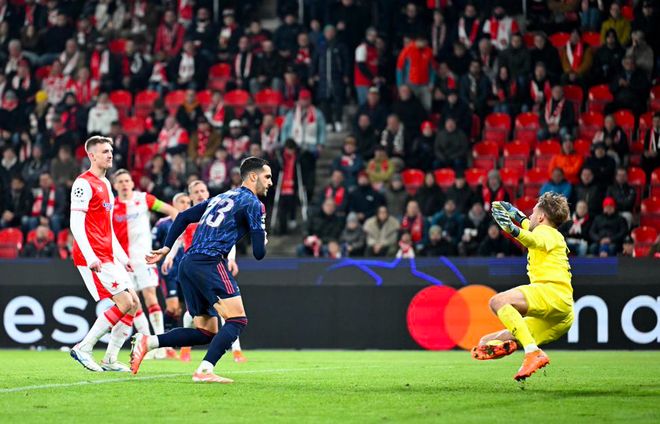第35分钟,戴上队长袖标的萨卡操刀主罚,球速快角度刁,门将判断正确也无济于事,枪手取得领先,这也是萨卡本赛季欧冠的第2个进球。
